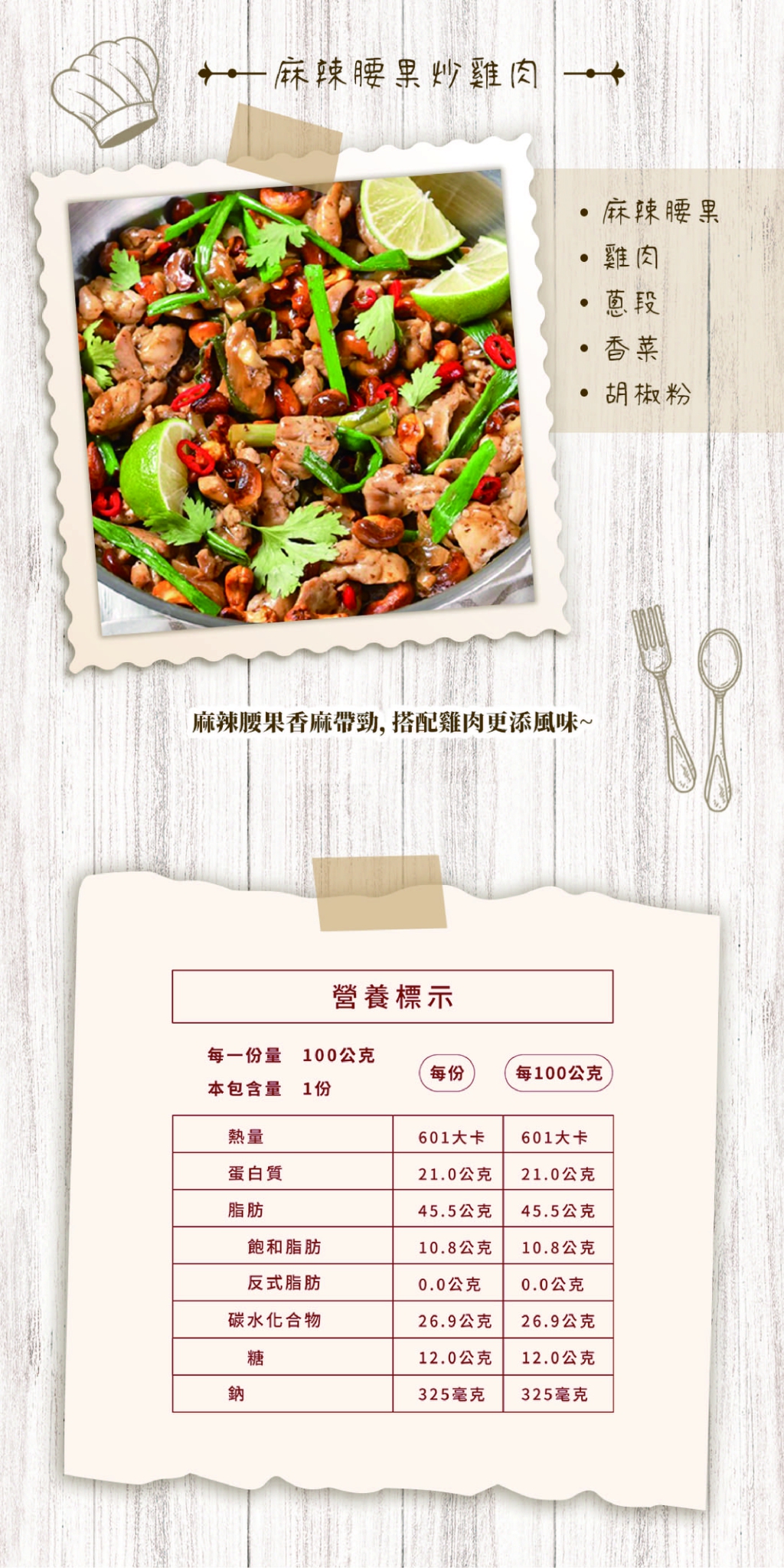 Hot & Spicy Cashew Nuts 重口味吃貨首選 真材實料的麻辣口味腰果,看得到片片辣椒跟花椒,與越南飽滿的腰果拌炒。 開袋即可聞到陣陣麻辣香氣,深受無辣不歡愛好者的歡迎。 獨家技術均勻拌炒,讓每顆腰果都能完整品嚐到麻辣滋味,是重口味吃貨的首選。 GTIN:4711363909379